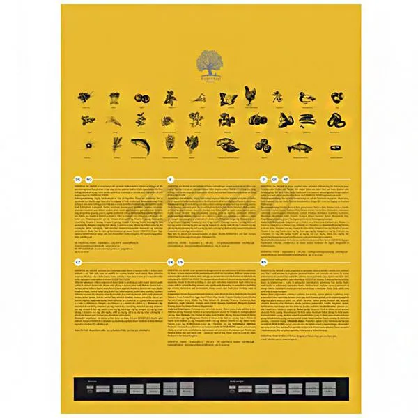 Ingrediente: carne proaspătă de pui și de rață, carne uscată de pui și de rață, somon și păstrăv proaspăt, cartofi, ouă proaspete, cartof dulce, mazăre, ficat de pui proaspăt, grăsime de pui, supă de pui, lucernă, fibre de mazăre, ulei de somon, afine, acai, mere, roșii, portocale, pere, morcovi, spanac, conopidă, gălbănele, alge maritime, ginzeng, ceai verde, chimbir, culturi probiotice.
