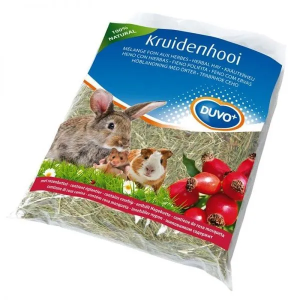 Fânul DUVO+ este un fân natural de înaltă calitate cu plante medicinale, utilizat ca parte a dietei iepurilor sau a altor rozătoare.