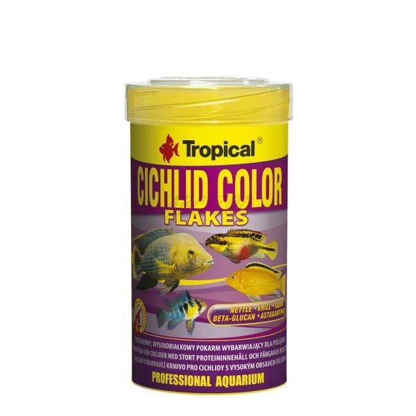 CICHLID COLOR este o hrană fulgi care intensifică colorația bogată în fibre pentru hrănirea zilnică a ciclidelor omnivore și carnivore și mulți alți pești din genus Tropheus din lacul Malawi.