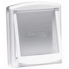 Ușă albă pentru câini și pisici, cu un tunel și un sistem de blocare magnetic.