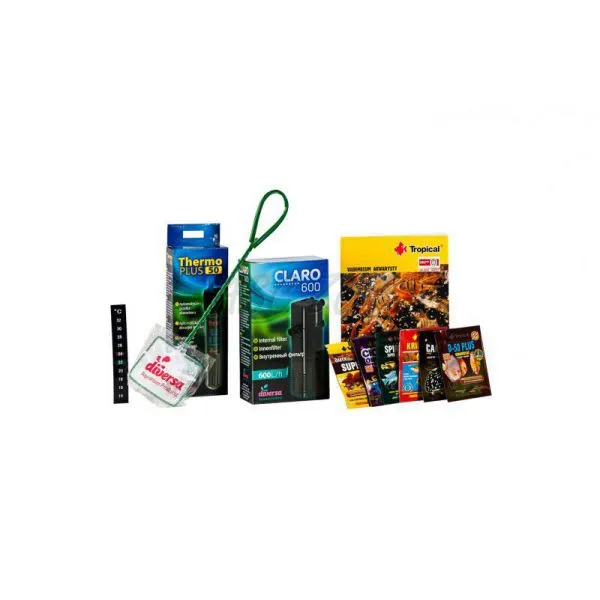 acvariu, capac din plastic cu iluminat LED, filtru Claro 600, încălzitor ThermoPlus 50 W, termometru, plasă, 2× mostră de hrană