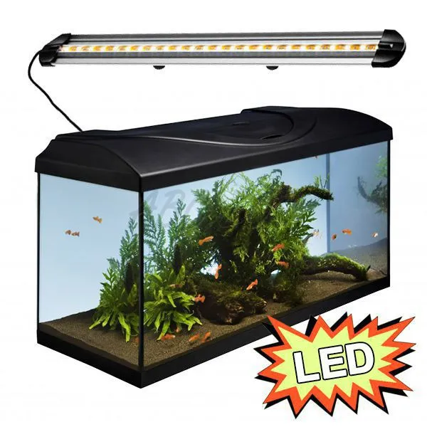 Set de acvariu cu sticlă frontală dreaptă, lățime de 60 cm și volum de 54 l, livrat cu iluminare, filtru, încălzitor, plasă și mostre de hrană.
