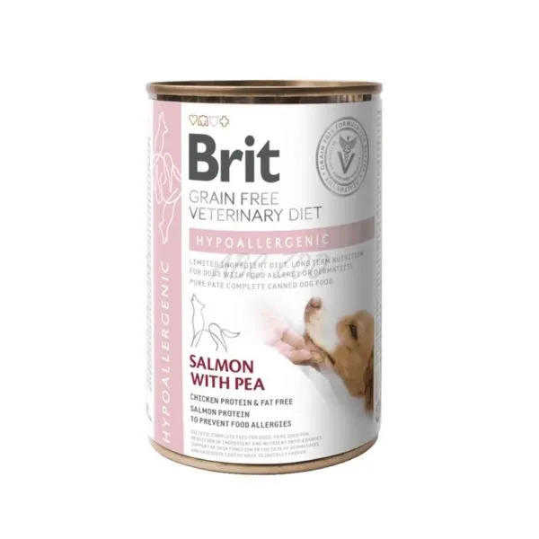Brit Veterinary Diets Hypoallergenic este o hrană hipoalergenică umedă cu somon și mazăre, pentru câini adulți de toate rasele, pentru a reduce intoleranța la anumite componente și nutrienți.