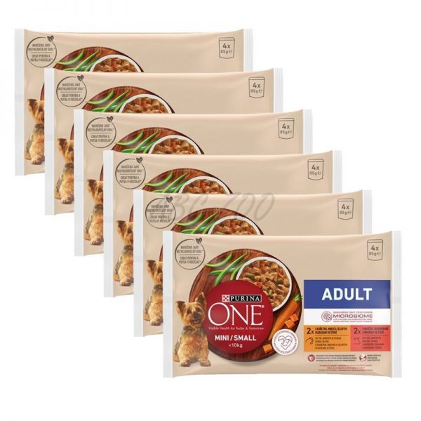 PURINA ONE MINI Dog Adult Pui și carne de vită în suc 6 x (4 x 85g)