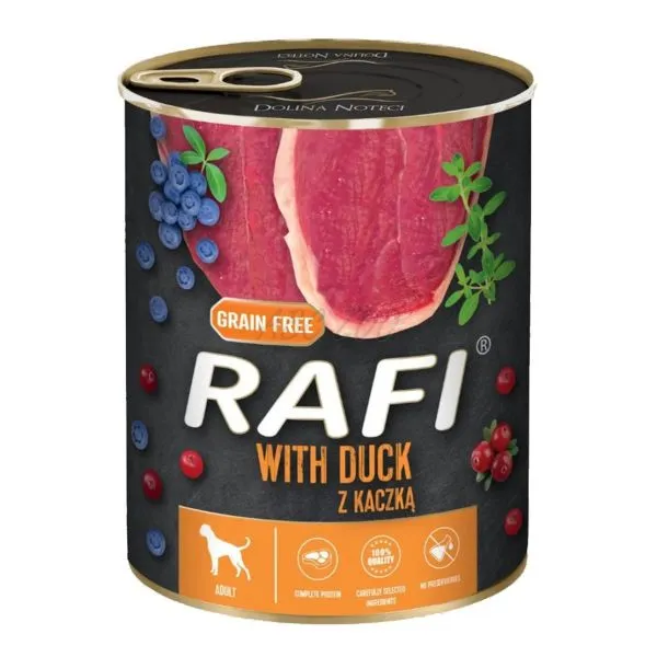 Rafi este o hrană umedă completă, fără cereale, la cutie, cu carne de rață, afine și merișoare, pentru câini adulți de toate rasele.