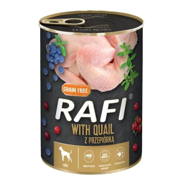 Rafi este o hrană umedă completă, fără cereale, la cutie, cu carne de prepeliță, afine și merișoare, pentru câini adulți de toate rasele.