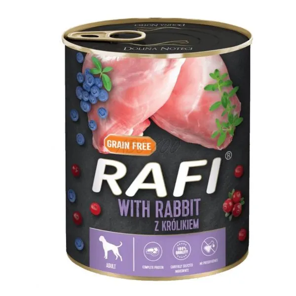 Rafi este o hrană umedă completă, fără cereale, la cutie, cu carne de iepure, afine și merișoare, pentru câini adulți de toate rasele.