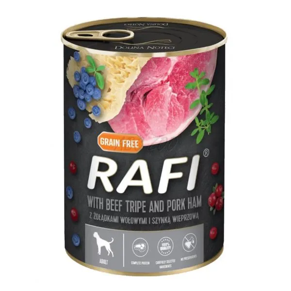 Rafi este o hrană umedă completă, fără cereale, la cutie, cu stomac de vită cu șuncă, afine și merișoare, pentru câini adulți de toate rasele.
