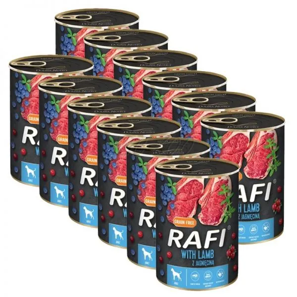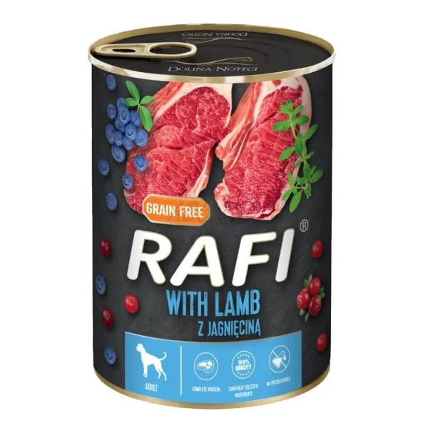 Rafi este o hrană umedă completă fără cereale, la cutie, cu miel, afine și merișoare, pentru câini adulți de toate rasele.