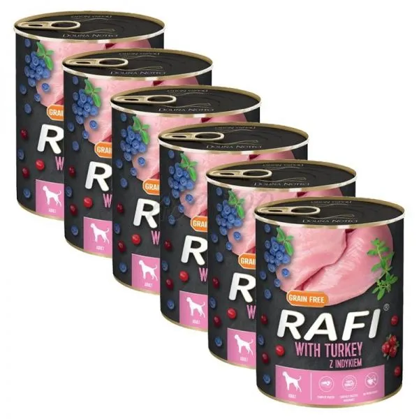 Rafi este o hrană umedă completă fără cereale, la cutie, cu curcan, afine și merișoare, pentru câini adulți de toate rasele.