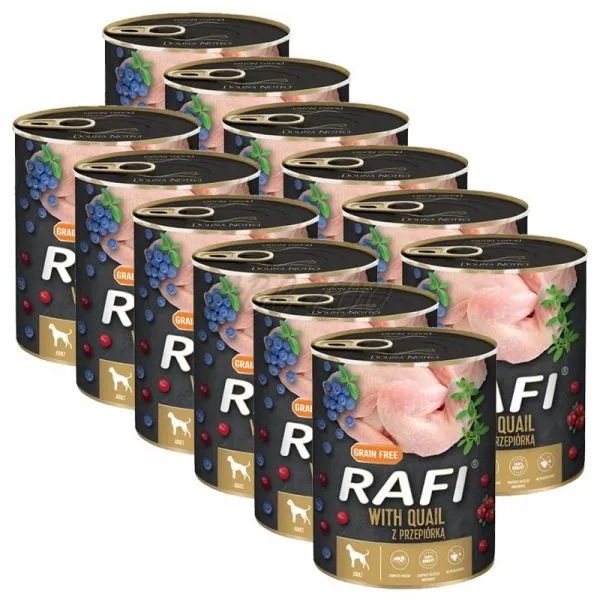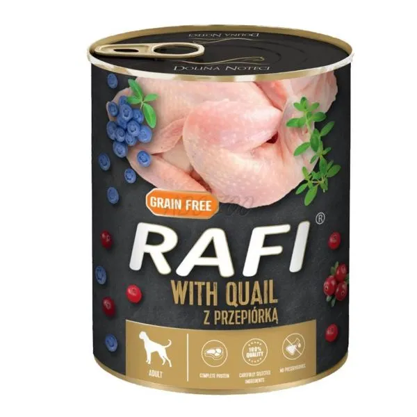 Rafi este o hrană umedă completă, fără cereale, la cutie, cu carne de prepeliță, afine și merișoare, pentru câini adulți de toate rasele.