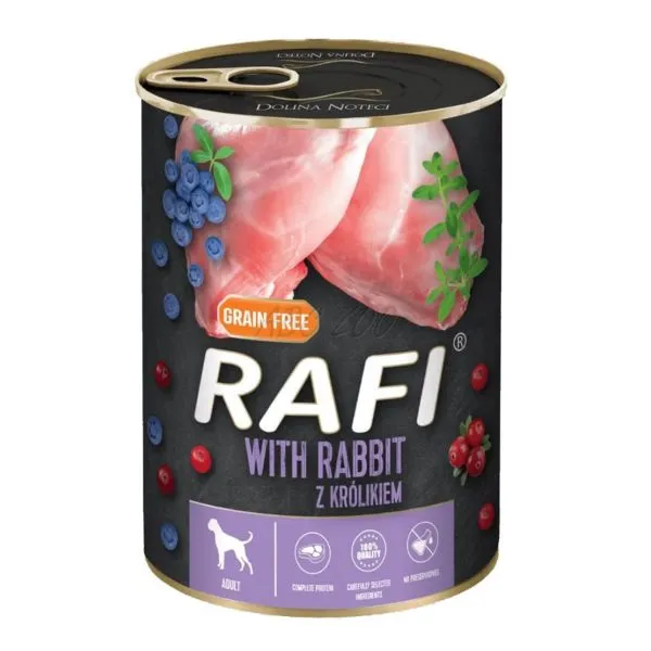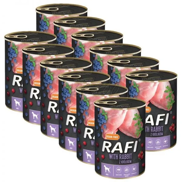 Rafi este o hrană umedă completă, fără cereale, la cutie, cu carne de iepure, afine și merișoare, pentru câini adulți de toate rasele.