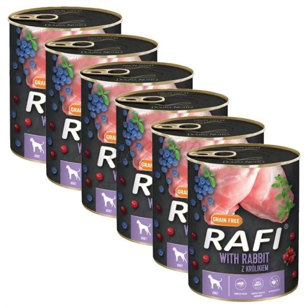 Rafi este o hrană umedă completă, fără cereale, la cutie, cu carne de iepure, afine și merișoare, pentru câini adulți de toate rasele.