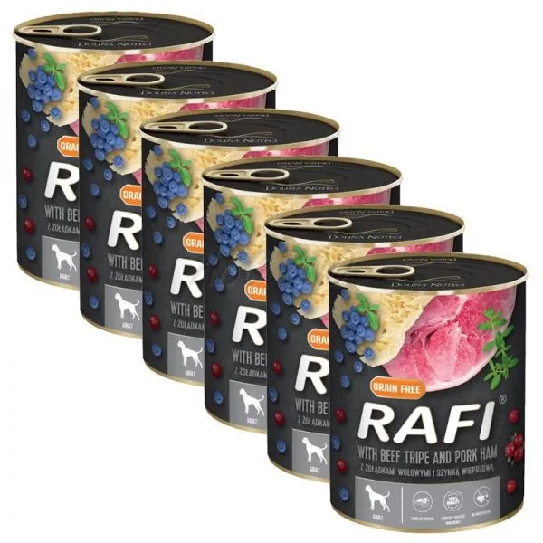 Rafi este o hrană umedă completă, fără cereale, la cutie, cu stomac de vită cu șuncă, afine și merișoare, pentru câini adulți de toate rasele.