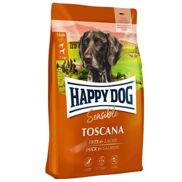 Happy Dog Sensible Toscana hrană completă pentru câinii adulţi indiferent de rasă, cu carne de raţă şi de somon. Datorită acestor ingredinte şi nivelului scăzut în grăsimi (7,5%) este alimentul ideal şi pentru câini sterilizați.