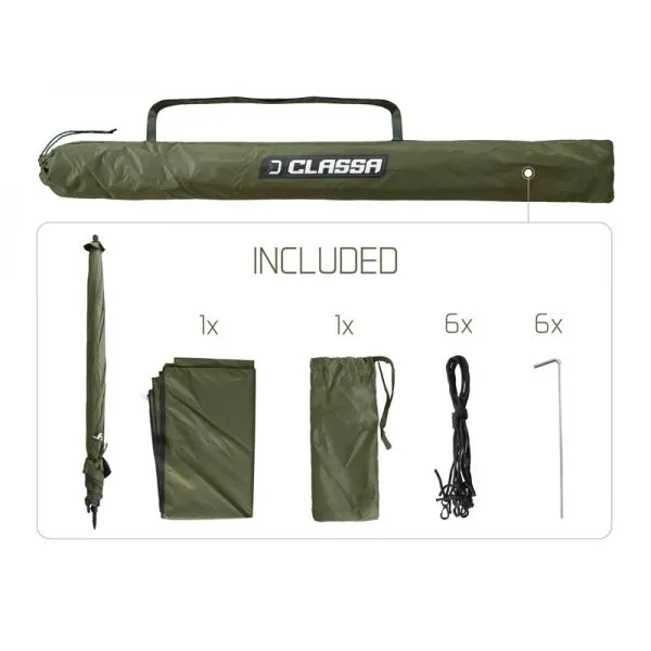 Cusăturile umbrelei sunt complet etanșate cu o bandă rezistentă la cald pentru a asigura o impermeabilitate de 100%, chiar și în caz de ploaie puternică. Pentru o mai bună stabilitate în bătaia vântului, umbrela CLASSA este echipată cu patru frânghii de ancorare. Este disponibil un perete lateral, extins, care se atașează la cupolă cu ajutorul unui fermoar de înaltă calitate. Partea de jos a panoului lateral este echipată cu elemente de fixare pentru fixarea acestuia la sol cu ajutorul unor cuie de fixare (cuiele sunt incluse în pachet).