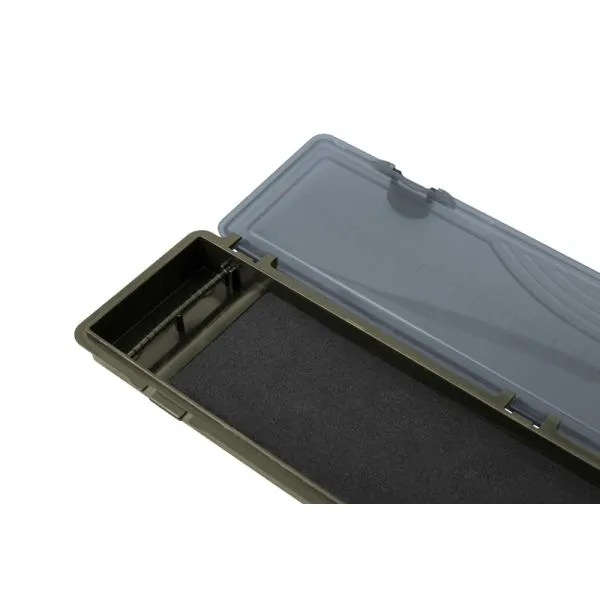 Penar rigid foarte practic Delphin C-RIGBOX pentru monturi de crap. În interior se găseşte o piesă cu clic pentru fixarea cârligelor şi spuma cu dimensiunile de 260x69mm în care este posibilă fixarea capătului monturii cu ajutorul acelor cu gămălie. Acele cu cap sferic galben în număr de 20 bucăţi se găsesc în două compartimente cu închidere. Penarul de culoare verde închisă se închide cu un capac gri transparent cu trei balamale şi două încuietori. Pe capac se găseşte o grilă practică în centimetri (30cm) şi in inch (12”). O piesă de dotare accesibilă ca preţ şi foarte practică nu numai pentru pescarii de crap.