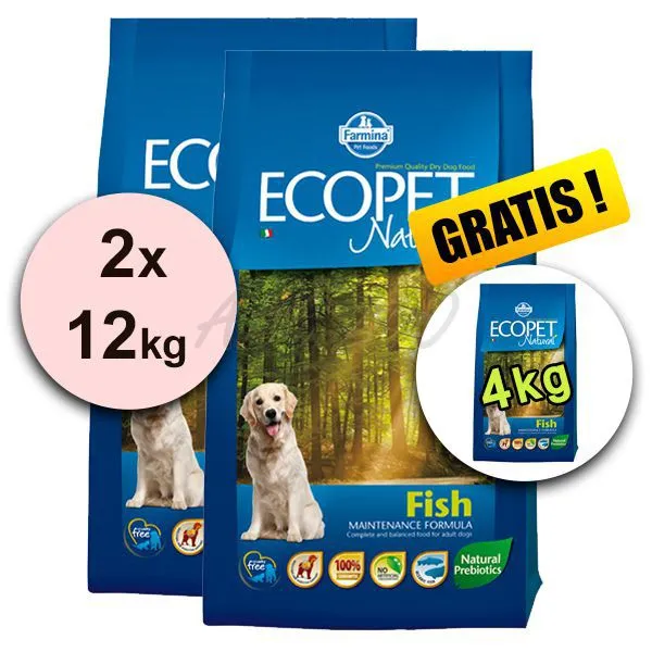 Hrană complet echilibrată pentru câinii adulți de talie medie.- Farmina - MO P ECOPET N dog fish maxi 2*12 kg + 4 kg GRATUIT.