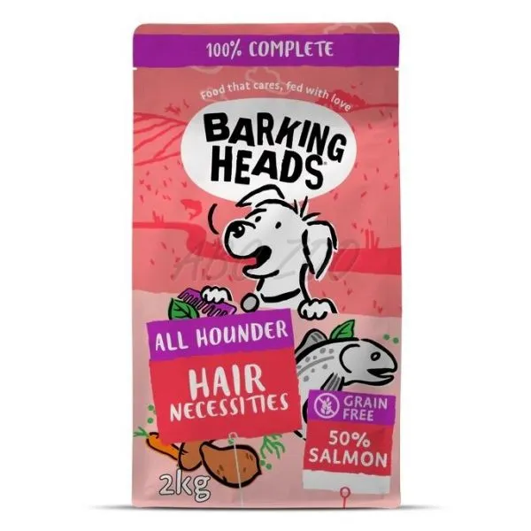 Barking Heads All Hounder Hair Necessities este o hrană uscată completă fără cereale cu somon pentru câini adulți.