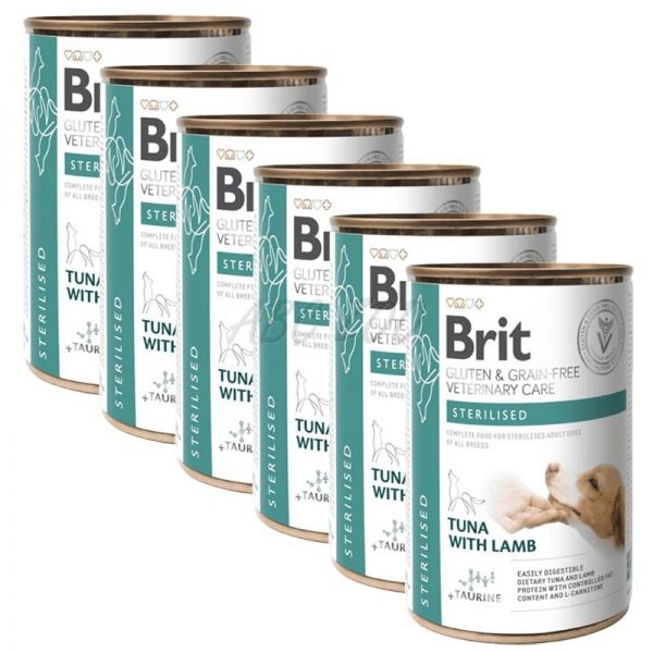 Brit Veterinary Diets Sterilised este o conservă de carne cu ton și miel, pentru câini adulți castrați de toate rasele.