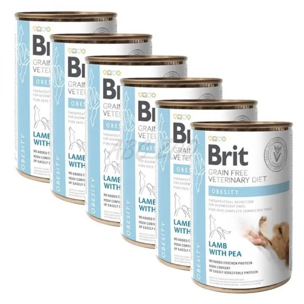 Brit Veterinary Diets Obesity este o hrană umedă echilibrată cu miel și mazăre, pentru câini adulți de toate rasele, pentru reducerea excesului de greutate.