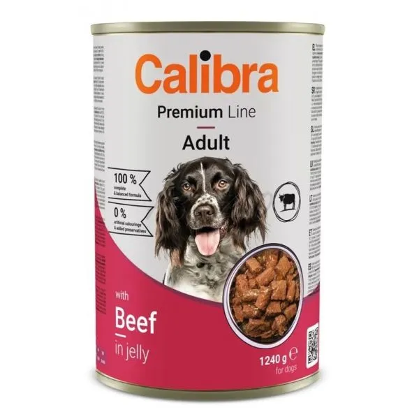 Calibra Dog Premium with Beef Jelly este o conservă de carne cu o rețetă completă și echilibrată pentru câini adulți.