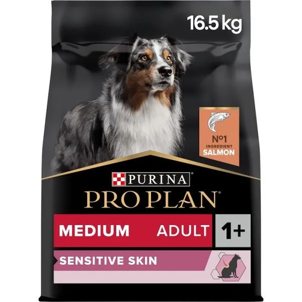 Purina PRO PLAN ADULT Medium Sensitive Skin hrană completă pentru câinii adulţi cu pielea sensibilă, greutate corporală între 10-25kg.