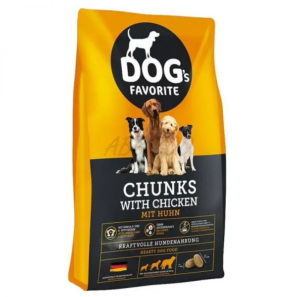 Dogs Favorite Chunks with Chicken este o hrană echilibrată și gustoasă pentru câini adulți de rase medii și mari cu nivel de activitate normal.