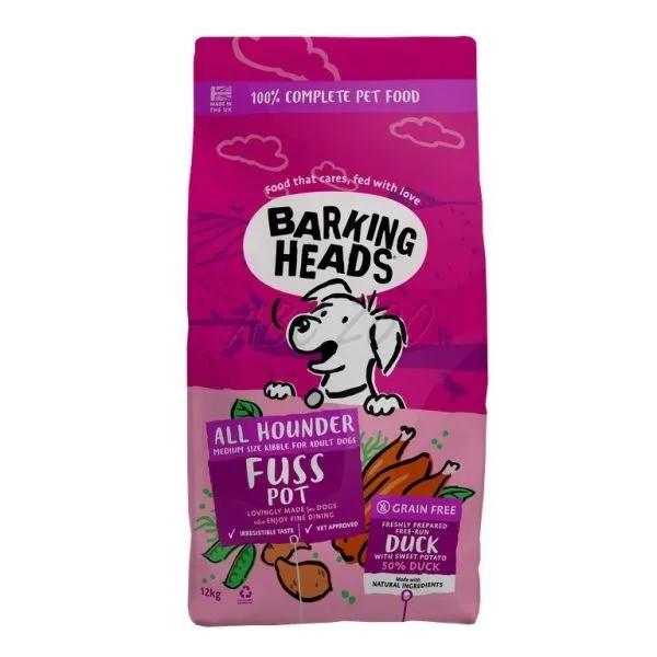 Barking Heads All Hounder Fuss Pot Pot Duck este o hrană fără cereale, cu un conținut ridicat de carne de rață pentru câini adulți.