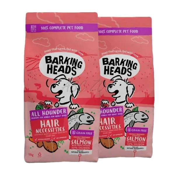 Barking Heads All Hounder Hair Necessities este o hrană uscată completă fără cereale cu somon pentru câini adulți.