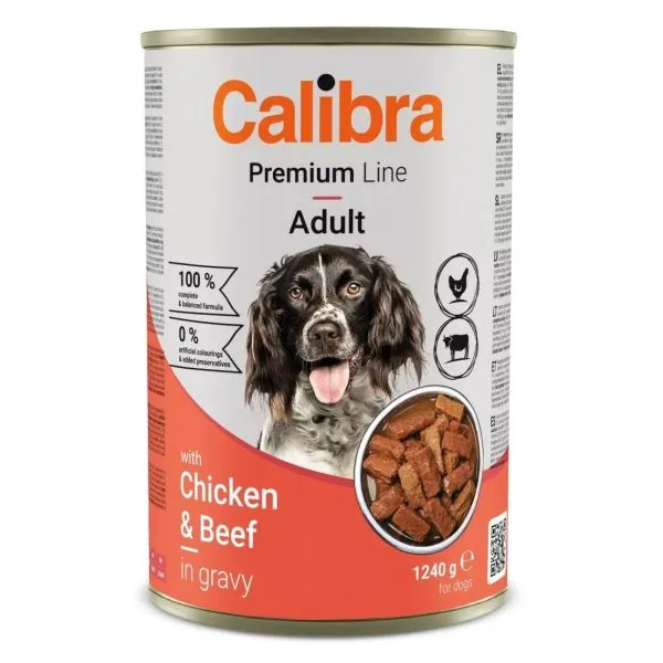 Calibra Dog Premium cu pui și carne de vită în sos este o rețetă completă și echilibrată de conserve de carne pentru câini adulți.