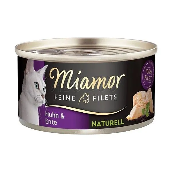 Miamor Feine Filets Naturell conține doar bucăți ușoare de file de pui în suc propriu cu rață, atât pentru pisicile adulte, cât și pentru cele senior.