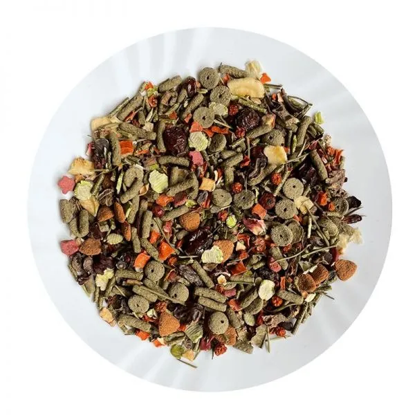 Ingrediente: lucernă, fructe (măceșe, scoruș păsăresc, stafide, mere, banane), grâu extrudat, porumb extrudat, fulgi de mazăre, roșcove, legume (pătrunjel, morcovi), fulgi de grâu, ovăz, orz.