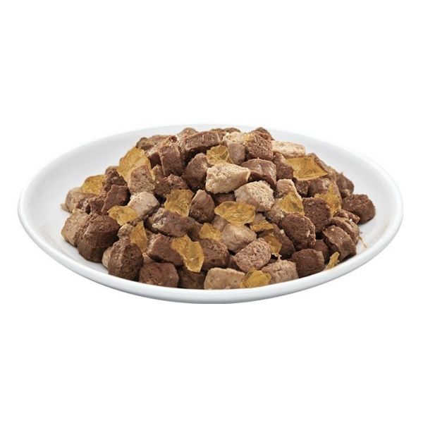 Cu iepure și curcan: carne și subproduse animale (4% iepure, 4% curcan), cereale, concentrate de proteine vegetale, minerale, zaharuri. Fără coloranți și conservanți.