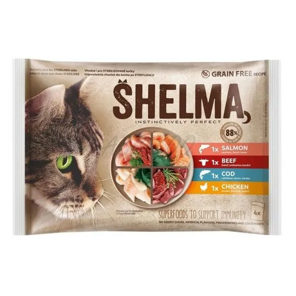 Shelma Capsule este o hrană completă fără cereale pentru pisici adulte, bogată în pui, vită, somon și cod.