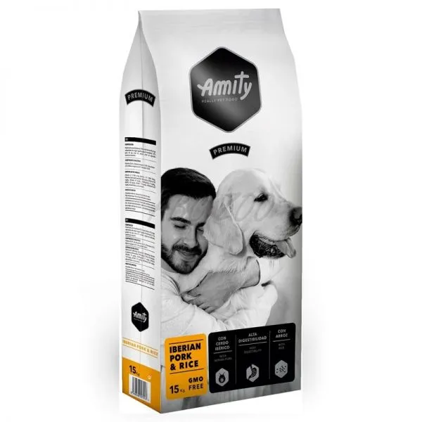 Amity Premium Iberian Pork and Rice este bogat în carne de porc iberic și orez, excelent pentru câini adulți de toate rasele.
