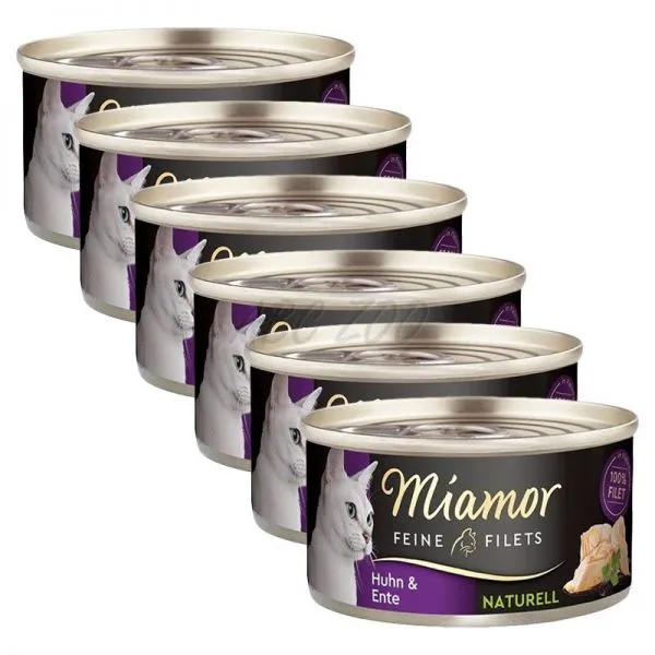 Miamor Feine Filets Naturell conține doar bucăți ușoare de file de pui în suc propriu cu rață, atât pentru pisicile adulte, cât și pentru cele senior.