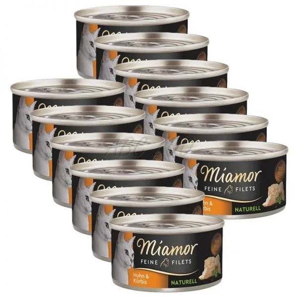 Miamor Feine Filets Naturell conține numai bucăți ușoare de fileuri de pui în suc propriu cu dovleac, atât pentru pisici adulte, cât și pentru cele în vârstă.