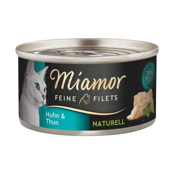 Miamor Feine Filets Naturell conține doar bucăți ușoare de fileuri de pui în suc propriu cu ton, atât pentru pisici adulte, cât și pentru cele în vârstă.