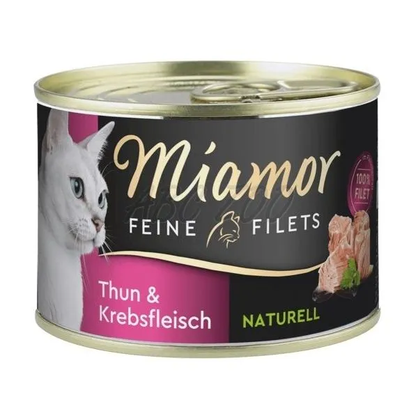 Miamor Feine Filets Naturell conține numai fileuri de ton light în suc propriu cu carne de crab, atât pentru pisici adulte, cât și pentru cele în vârstă.
