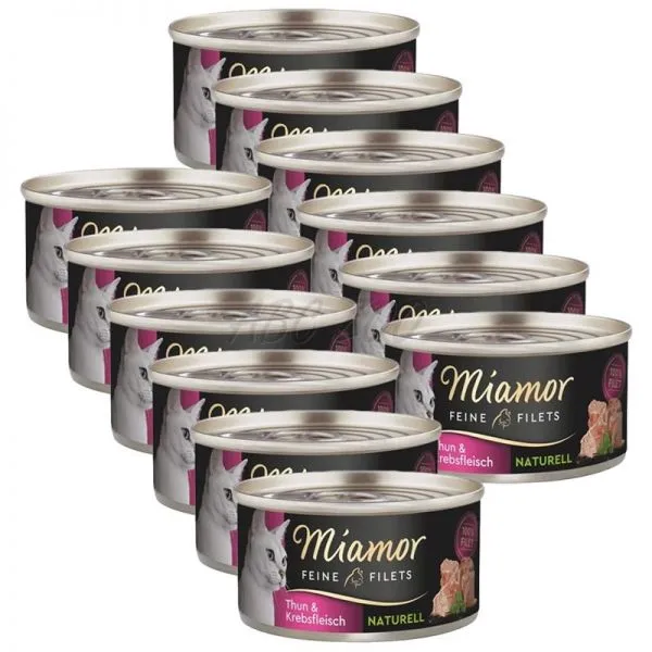 Miamor Feine Filets Naturell conține numai fileuri de ton light în suc propriu cu carne de crab, atât pentru pisici adulte, cât și pentru cele în vârstă.