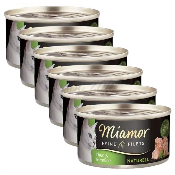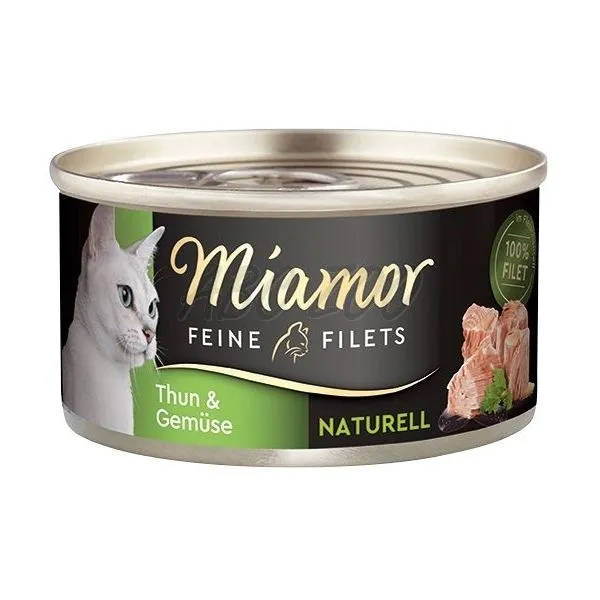 Miamor Feine Filets Naturell conține numai fileuri de ton light în suc propriu cu legume, atât pentru pisici adulte, cât și pentru cele senior.