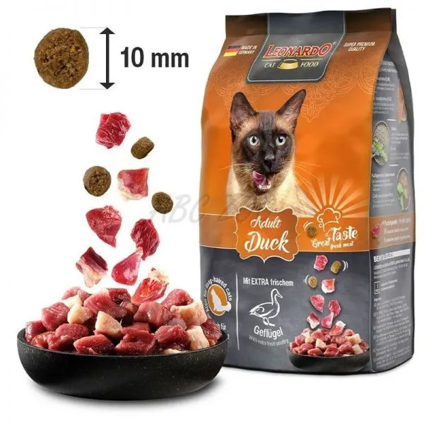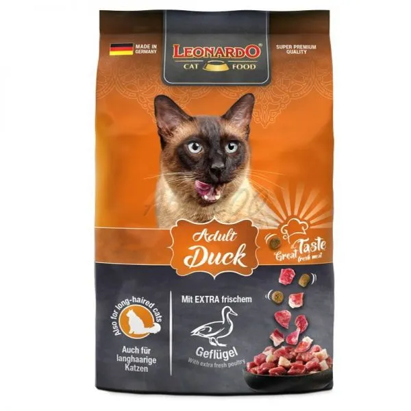 LEONARDO Adult cu rață este o hrană completă gustoasă pentru pisicile care iubesc carnea de pasăre. Rețeta a fost îmbunătățită și prin adăugarea de semințe de chia și krill delicios - crustacee din Antarctica. Conținutul ridicat de acizi grași Omega-3, împreună cu lecitina, ajută la menținerea pielii sănătoase și a blănii strălucitoare.