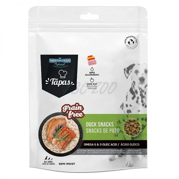 Mediterranean Natural Tapas sunt gustări sănătoase cu carne de rață pentru câini de toate dimensiunile și rasele.