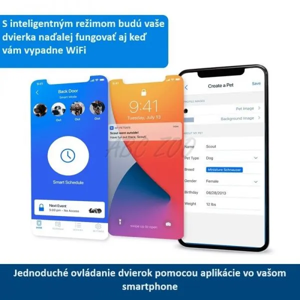 Prin intermediul aplicației My PetSafe®, veți putea configura programe individuale pentru animalele dvs. de companie, permițându-le accesul prin ușă doar la anumite ore. Puteți verifica notificările de mișcare pe telefon sau smartwatch. Primiți alerte atunci când animalele dvs. de companie folosesc ușa, când aceasta este încuiată și multe altele. Dacă observați o furtună care trece prin oraș, utilizați telefonul pentru a activa de la distanță încuietoarea multipunct de pe ușă pentru a vă menține câinele sau pisica în siguranță în interior. Etanșarea dinamică a ușii este eficientă din punct de vedere energetic și menține elementele nedorite și fluxul de aer acolo unde le este locul - în afara ușii. Clapeta ușii este fabricată din plastic durabil și este colorată pentru intimitate, astfel încât niciun ochi indiscret nu va trage cu ochiul în casa dvs.SmartDoor vine în 2 dimensiuni diferite: MEDIUM și LARGE. Acestea sunt alimentate de baterii sau de un adaptor (vândut separat) și necesită o conexiune Wi-Fi de mare viteză de 2,4GHz.