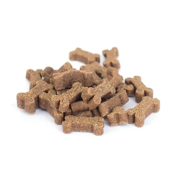 Biscuiții pentru câini Mediterranean Natural sunt fin tăiați în bucăți mici, în formă de os, conținând șuncă Serrano de înaltă calitate.