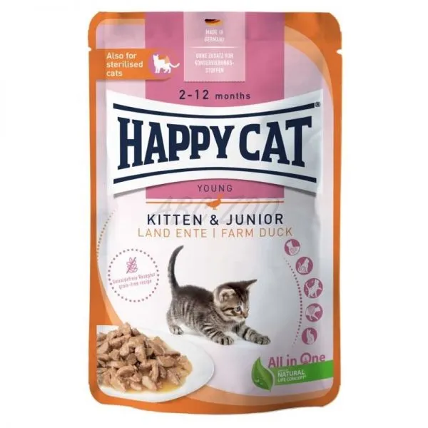 Pliculeț Happy Cat cu bucăți fragede de carne de rață într-un sos delicios pentru pisoi de la 2-12 luni.