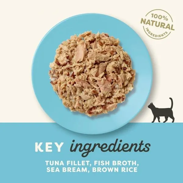 Applaws Tuna Fillet with Sea Bream in Broth este o hrană naturală premium pentru pisici, fabricată din ton de înaltă calitate și carne de doradă într-un bulion delicios.