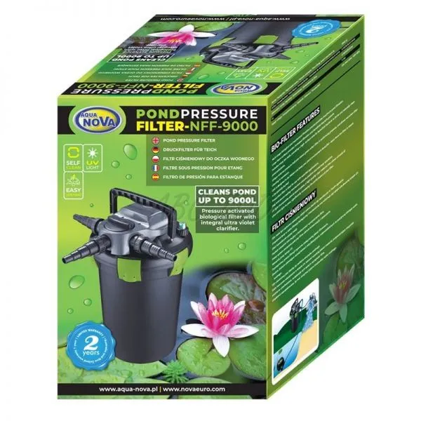 Aqua Nova NFF-9000 este un filtru de iaz sub presiune cu lampă UV-C pentru filtrarea mecanică și biologică eficientă a iazurilor de grădină de până la 9.000 litri.