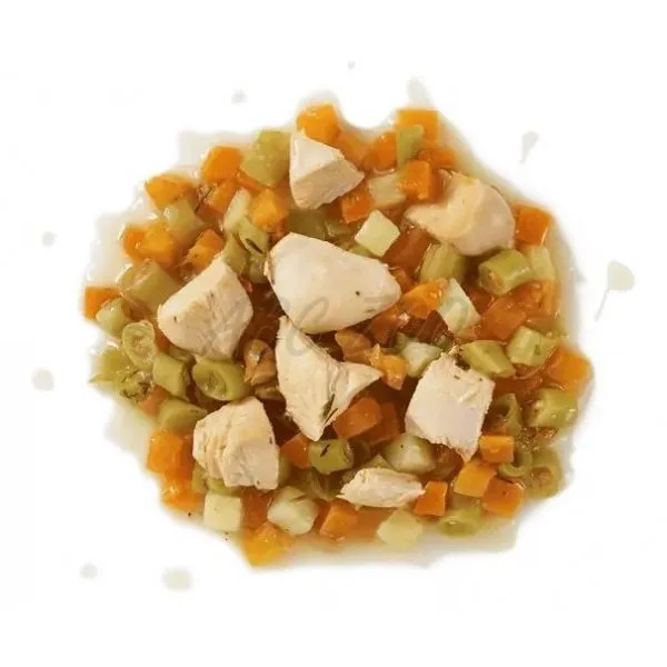 Ingrediente: Piept de pui 40%, morcovi 10%, fasole verde 10%, cartofi 5%, agent gelifiant vegetal, cimbru